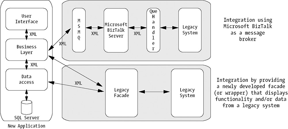 Figure 1-3 shows an example of an application that integrates new functionality with data from legacy systems. As you can see, the design is still n-tier to provide for maximum flexibility and scalability.