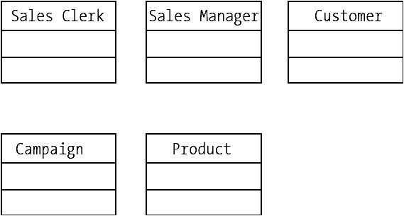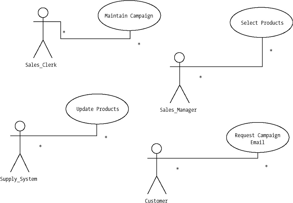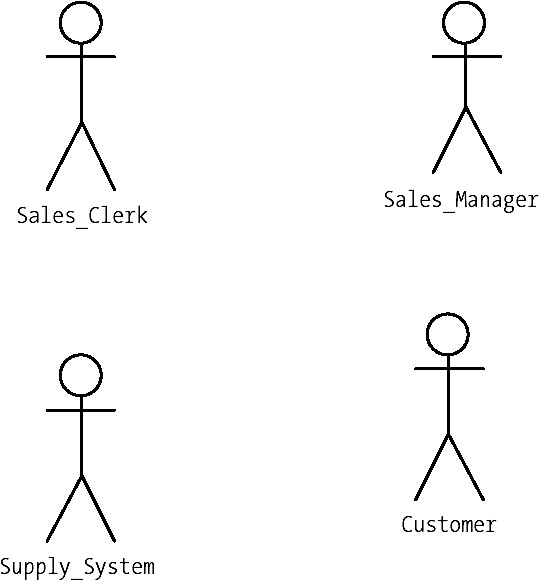 Let us continue our simple scenario from earlier. We have already mentioned two actors: the sales clerk and the sales manager. Do we have anyone else? One actor that immediately comes to mind is the customer. Another one might be a supply system, that is, a system that keeps track of our products and the information related to them (like stock, price, and description).
