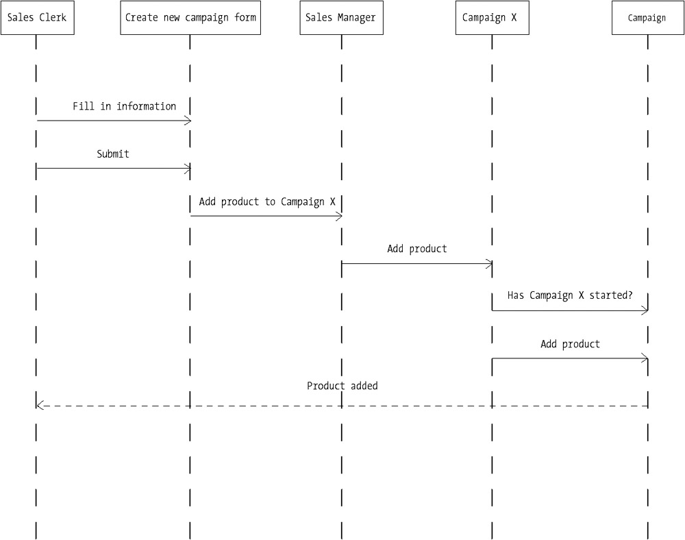 First the clerk fills in information about the product to be added to Campaign X. He or she then submits the information to the sales manager to see if the product is valid for this campaign. If the product is approved for addition, the manager tells the campaign object to add the product. The campaign object then checks that the campaign has not started, and if it has not, the product is added.