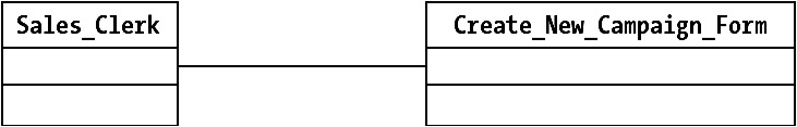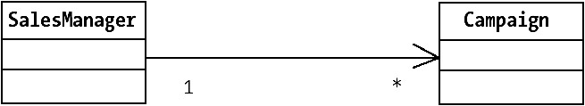 Navigation is represented by an arrow. You should try to start the arrow at the class that initiates communication between classes. The sales manager in our case initiates the communication with the campaign, which is why the arrow shown in Figure 1-21 starts at the SalesManager class.