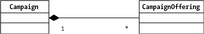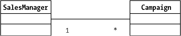 We will now spend a few moments on multiplicity and navigation. Multiplicity simply states how many objects participate in a relationship. It shows how many instances of one class relate to one instance of the other class. Based on this, you need to decide for each end of an association and aggregation what multiplicity is needed. Since multiplicity defines the number of instances, you represent it in your diagram with either a number or an asterisk (*). The asterisk is used to represent a multiplicity of many (see Figure 1-19). In our previous example, we could say that one campaign can only be owned by one sales manager. But one sales manager can own several campaigns. This is known as a one-to-many relationship, which would be represented as 1 − *.
