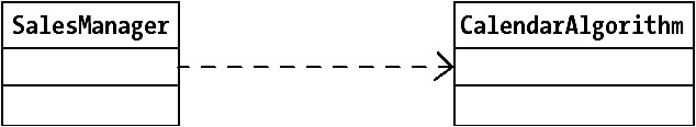 Figure 1-18 shows the third kind of relationship, the dependency. As you can see in this figure, the dependency is represented by a dashed line. It points from a client to a supplier. The client does not have to have semantic knowledge of the supplier, and so this is a weaker form of relationship. It shows that a change in the specification of one class may affect another class that uses it. Keep in mind that the reverse may not necessarily be true. Use dependencies when you want to show that one class uses another class.
