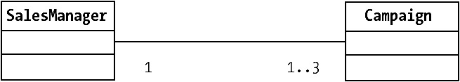 You decide multiplicity by examining your business rules. For our example, we could have a business rule stating that one sales manager can own only three campaigns. Then we would have a one-to-three relationship, as Figure 1-20 shows.
