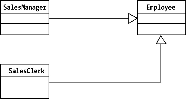 Inheritance is the relationship between a superclass and a subclass. In our example, if we have a class called Employee, we can have other classes like SalesManager or SalesClerk that are separate classes but still fall under the Employee class. That is, a SalesManager is an Employee. In Figure 1-22, you can see this relationship is shown with a triangle.