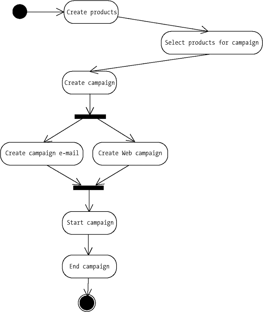 An activity diagram shows the flow of control. Activities are action states that move, or transition, to the next state after completion. In Figure 1-8, you can see activities as rounded rectangles. Our example shows a simple flow of control for the creation of sales campaigns mailed to registered customers, which are also published on a Web site. All transitions between the activities are represented by an arrow. To show activities performed in parallel, we use synchronization bars.