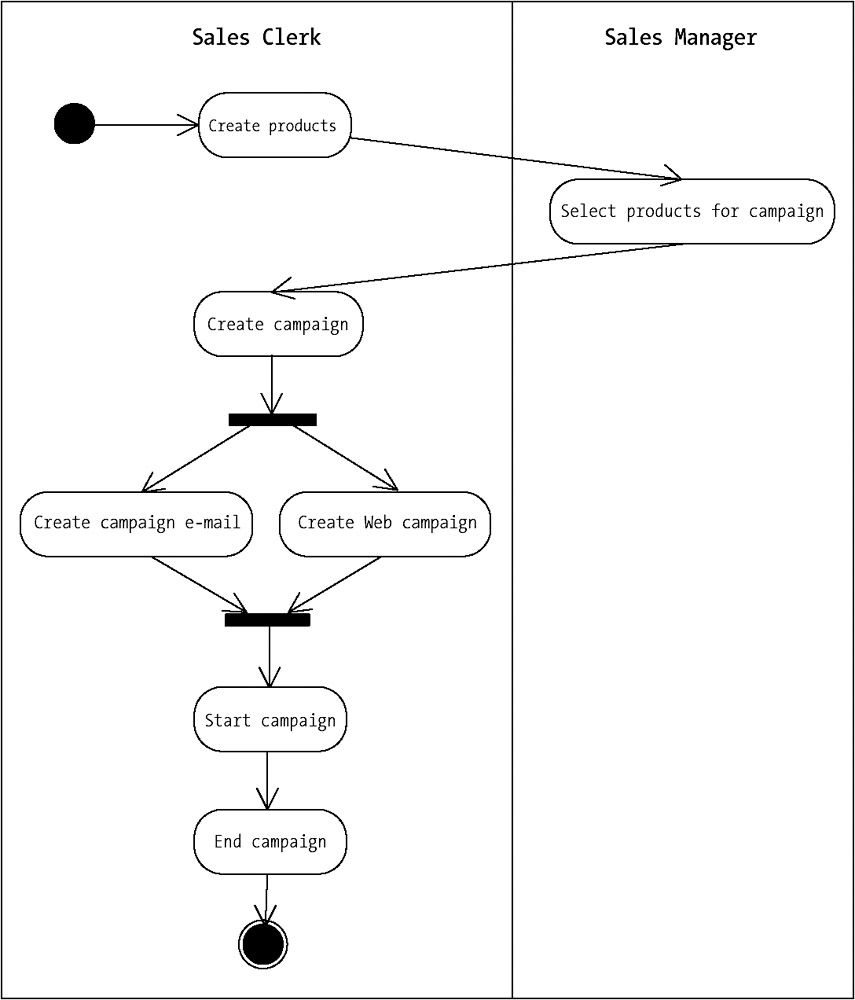 In your activity diagrams, you can use something called swim lanes to show ownership. In Figure 1-9, we have added a swim lane to our activity diagram to show the responsibilities of sales clerks and sales managers.