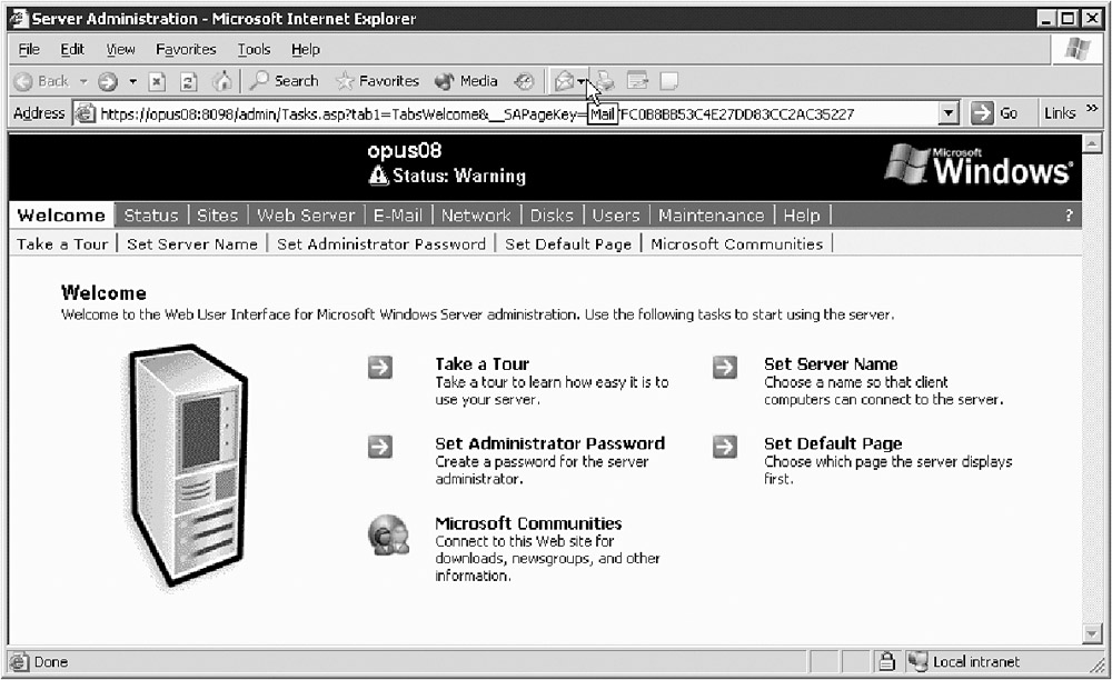 All Windows 2000 Server versions come with a built-in Web server: Internet Information Services 5.0, also referred to as IIS. In Windows NT 4.0, this Web server was called Internet Information Server 4.0 and came with the Windows NT 4.0 Option Pack. Note the difference: Now it is a service, before it was a server—same as with the Microsoft Cluster Service (MSCS). We will take a closer look at IIS in Chapter 7, where we will compare IIS 5.0 with the new IIS 6.0 released with Windows Server 2003. One thing worth mentioning here, though, is the inclusion of better support for Active Server Pages (ASP) in IIS 5.0, which gives you better options for building dynamic Web solutions.