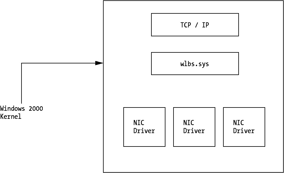 All servers in an NLB cluster host a driver called wlbs.sys. You might recognize the first part of the name from earlier in the chapter. WLBS is, of course, Windows Load Balancing Service, and it is a surviving Windows NT 4.0 driver. Or, at least, the name survived. The driver determines which server handles the incoming request by using a statistical mapping algorithm. The wlbs.sys driver runs between TCP/IP and the network driver, as you can see in Figure 3-3.