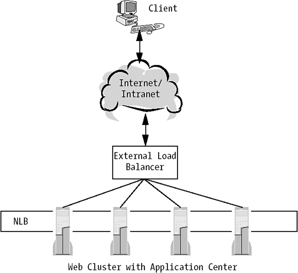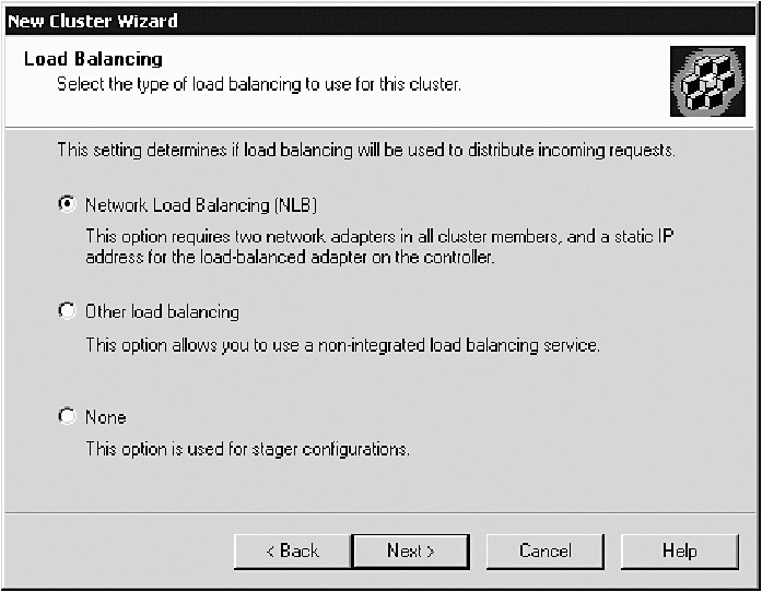 The most common cluster using Application Center would be a Web server cluster that hosts Web sites as well as local COM+ components (or assemblies in .NET). These clusters can use several load-balancing techniques. Application Center does not care if you use load-balancing techniques other than Network Load Balancing. In Figure 3-10, you can see that during setup of a new cluster you can choose the type of load balancing you will use. You still get the advantages of clustering several servers that we have already discussed.