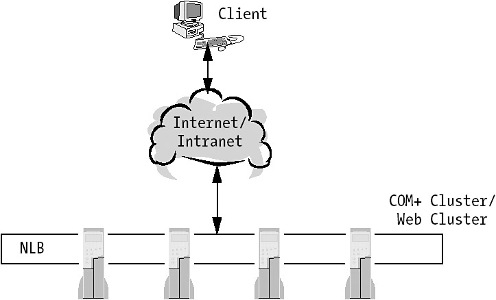 In the Web pages of a Web application, different components are instantiated to serve the application with data of various sorts. You could, for instance, have an application where a salesperson looks up customer data by calling a COM+ component that has a function named GetCustomerData. It really does not matter whether the application is a Web application or if it is a thick Windows client, the instantiation is the same. If the GetCustomerData component resides on a different server than the application itself, and there are many users accessing this component, the workload on the server can be immense. To ease the pressure on the server, you can create a cluster of servers to handle these COM+ components, just as you might do with your Web site. The benefits of doing this are the same as for Network Load Balancing described earlier. Application Center COM+ clusters load balance the method calls to instantiate the components across multiple cluster members within the COM+ cluster. A simplified scenario of this is shown in Figure 3-12. This cluster uses Network Load Balancing as a load balancer.