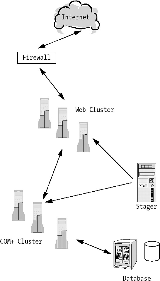 The first example (Figure 3-21) shows an internal network protected by a single firewall. The Web cluster, COM+ cluster, and stager are all behind this firewall. The database is also protected only by this firewall.