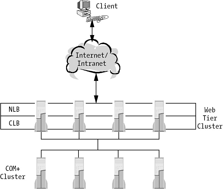 But in a more likely scenario than the one just described, the layering of the application would be different. To ease the load on the Web cluster, the COM+ components would probably be moved to their own cluster and Component Load Balancing would be used to load balance the activation requests for the COM+ components as shown in Figure 3-13.