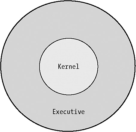 If you want to optimize and secure your system, you need to spend a little time on this piece of operating system machinery. The kernel is basically the system32 directory in the Windows catalog on the hard drive. It is made up of many files, including .dll, .exe, and .com files. The executive, shown in Figure 4-2, serves to protect the kernel. This is the part of the operating system that applications access. This way nothing ever accesses the kernel itself, and it becomes harder to sabotage the system.