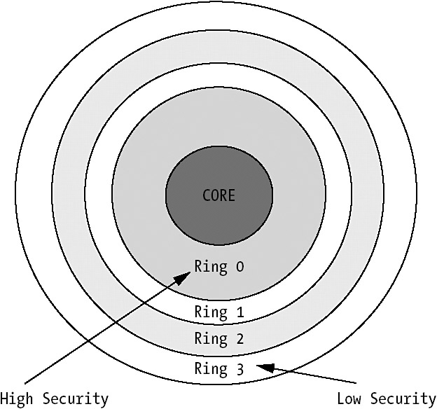 These layers can be seen as hardware-based security. The closer you get to the core, the more secure the environment is. You can think of these rings as the walls surrounding the Helm's Deep fortress in The Lord of the Rings, which took a lot of energy and time to break through. The inner ring, ring 0, is where the operating system resides. Not much can touch this ring. Your applications reside in ring 3, on the other hand, and do not have much protection at all.