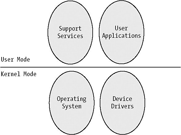 In Figure 4-5, you see a simplified view of what kinds of applications and services execute in these two modes. The main point of these two modes is to protect the operating system from applications. User applications should not be allowed to access or modify operating system data directly. When an application needs the services of the OS, it makes a system service call. The operating system then validates the request and switches the processor from user mode to kernel mode, thereby allowing the request to be processed. After the system service call is completed, the processor mode is switched back to user mode before returning control to the user application.