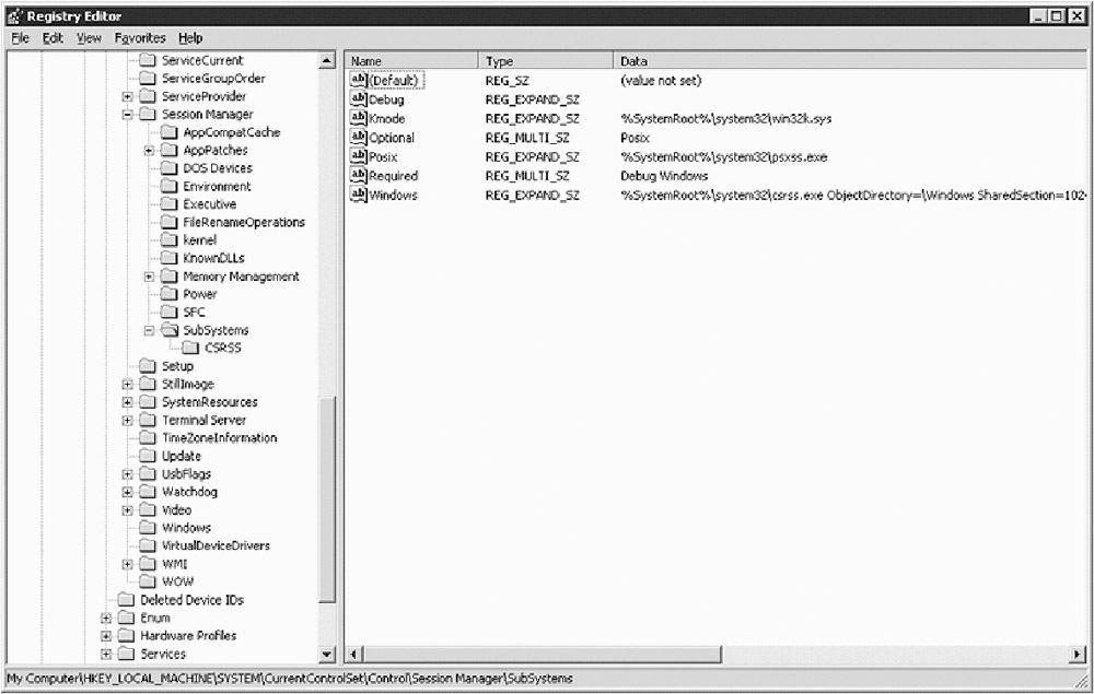 Windows 2000 provided support for Win32, OS/2, and POSIX subsystems. In Windows Server 2003 there has been a slight change. Now only Win32 and POSIX subsystem support remains. To check which subsystems are installed and the operating system files they use, open the registry editor and look at the following registry key (see Figure 4-8):