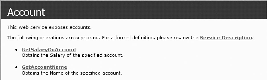 To test the project, right-click Account.asmx, choose Set as Start Page, and then choose Start from the Debug menu or press F5 to build and run the project. This will launch a service documentation page in Internet Explorer that should look like the one in Figure 6-10.