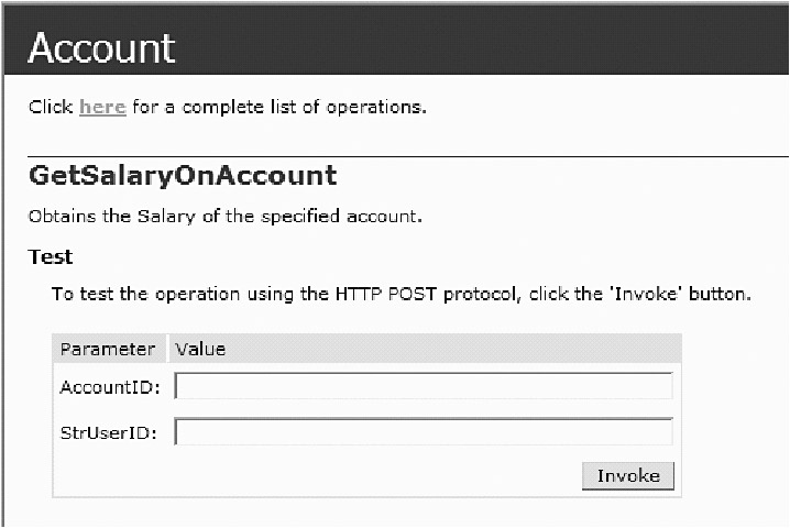 This is a default page that is automatically generated. If you click GetSalaryOnAccount, you will be transferred to the test page shown in Figure 6-11. On this test page you can invoke the selected method on the Web service and also pass it the different parameter it requires.