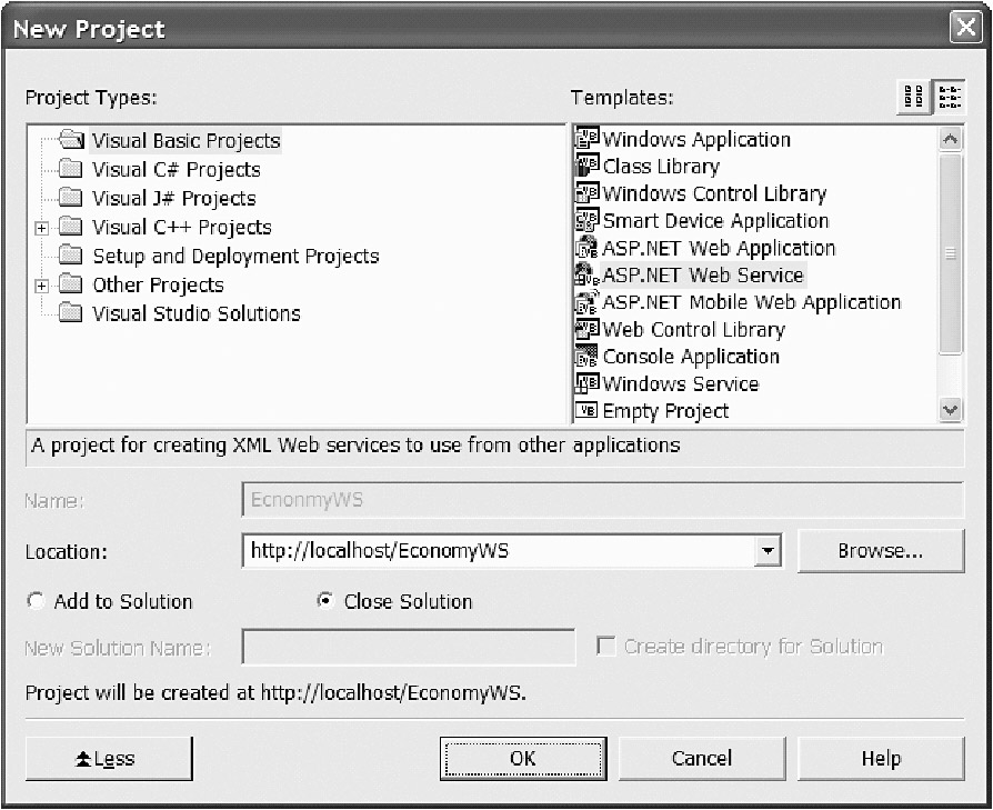 Select ASP.NET Web Service under Templates, and also specify where the Web service should be located on the server (see Figure 6-8). For this example, we specified EconomyWS.