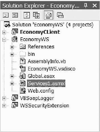 We assume that you are probably familiar with the VS .NET development environment, hence we will give only a short overview here. The Solution Explorer contains the projects that are loaded in the solution (a solution is a group of files gathered from different projects). This ASP.NET Web service project sets up one empty .asmx page (which is the actual Web service) and a global.asax page (because this Web service is an application in the Web server). The global.asax page can contain global information for all pages in the Web service, such as logon credentials. It also contains the old events that will occur in this application—Application_Start, Application_End, Session_Start, Session_End—as well as some other events such as Application_BeginRequest, Application_AuthenticateRequest, and Application_Error.