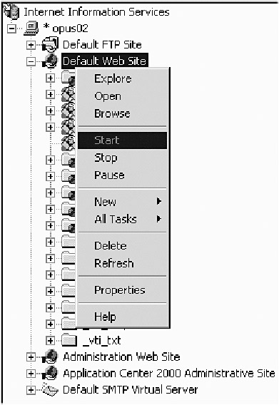 If an error occurs, the best way to solve the problem is not by rebooting the server. This behavior was what gave Microsoft's operating systems a bad reputation in the first place. Nonetheless, in the past this was necessary to unload troublesome applications from memory and restart the Web server. Imagine if the same had to be done if a CD player in a car started misbehaving: "Sorry, a CD player error has occurred. Please turn off the engine and restart the car." You would probably not buy that car. To overcome errors, Windows 2000 includes IIS Reliable Restart, which provides a faster, easier, and more flexible one-step restart, shown in Figure 7-5. The administrator can restart IIS by right-clicking an item in the MMC.
