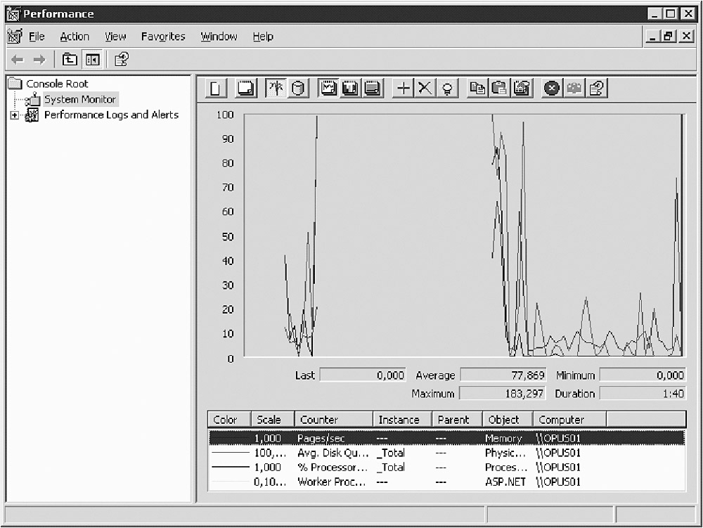 To gather a baseline, you use the Performance Monitor in Windows 2000, shown in Figure 7-8, and the built-in performance counters that the operating system and IIS provide.