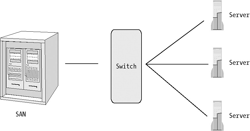 The SAN concept is quite simple. An external RAID (short for redundant array of independent disks, sometimes called redundant array of inexpensive disks) cabinet has a connection directly from the Host Bus Adapter (HBA) to the external RAID subsystem. The SAN, on the other hand, connects the HBA to a switch instead, providing other servers access to the data storage that way (see Figure 8-1).