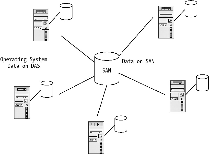 A SAN is a specialized network, the sole purpose of which is to provide access to high performance and highly available storage subsystems. This solution is quite interesting. The SAN is constructed of several devices, all interconnected by fiber or copper wiring. The subsystem is available to multiple applications at the same time, just like a network-attached storage appliance. The major difference is that it provides higher scalability and performance. Even though a DAS is still faster than a SAN, this performance gap is diminishing constantly with the evolution of SAN technology. (For more on DAS, see the section "Direct-Attached Storage.")