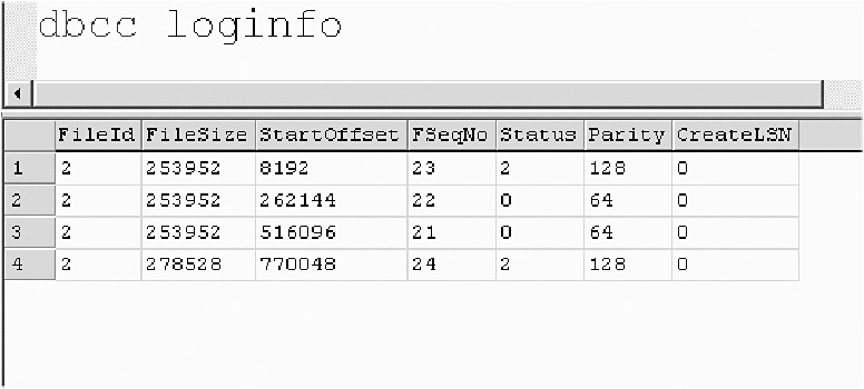 If you have too many VLFs, the overhead of maintaining them can degrade performance. To view how many VLFs exist in your databases, you could use an undocumented DBCC command, which returns as many rows as there are VLFs in the database. Execute DBCC LOGINFO and have a look at how your database appears. In Figure 8-10, we have run DBCC LOGINFO against the Northwind database on our system. As you can see, a total of four VLFs exist in our database.