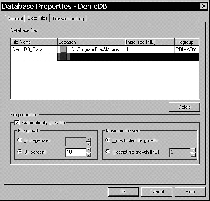 A cool feature of SQL Server is that you do not have to expand the files manually when they run out of space. SQL Server handles this by itself, if you specify this when creating the file (see Figure 8-12).