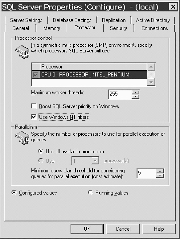 You can use SQL Server Enterprise Manager to enable fiber mode (see Figure 8-13), or you can run sp_configure to set the lightweight pooling option to 1.