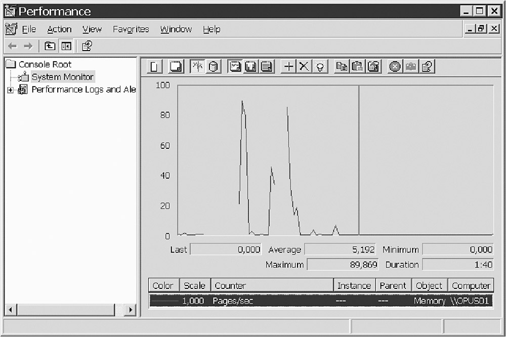 Carefully use these options so that no application (including SQL Server) starts any excessive swapping. You can keep an eye on this by using the Performance MMC (see Figure 8-6) and the Pages/sec counter of the memory object. This counter shows the paging on the system. A value between 0 and 100 is considered normal.