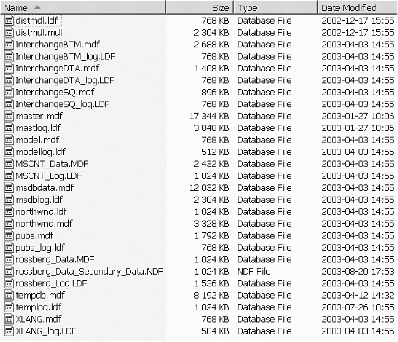 Log files are files that hold all the information about the transactions in the database, and they cannot be used to hold any other data. You can have one or more log files (like the ones shown in Figure 8-8 with an extension of .ldf), but our recommendation is to use one only. This is because the log file is written to sequentially, and hence does not benefit from being separated on several physical disks. To enhance performance, you should instead try to use RAID 1+0, and place the log file on such hardware.