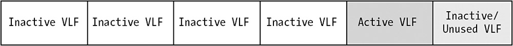One important thing to understand about the log file is that it actually consists of several files, regardless of whether you use only one or not. These files are called virtual log files (VLFs) and are created by SQL Server (see Figure 8-9). Of these virtual log files, only one is active at a time. When a backup of the log is performed, all inactive VLFs are cleared. The active VLF is never cleared, so contrary to what you might have been told, a log backup does not clear the whole log. But do not worry, this is not a problem.