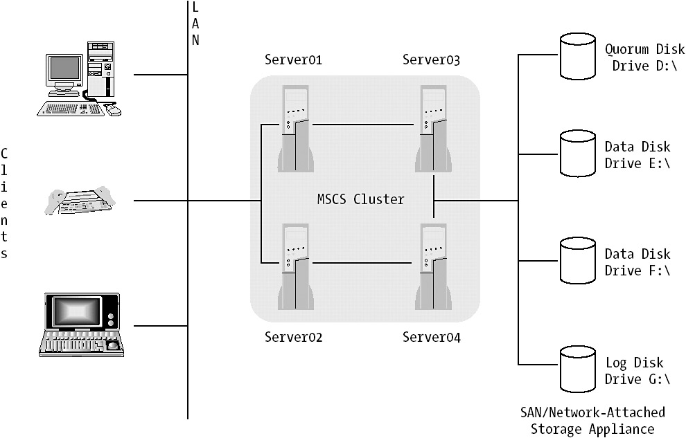 SQL Server is built as a cluster-aware application and can therefore use MSCS to provide high availability. In Windows Server 2003, you can have up to eight nodes in a cluster, and you can also disperse the nodes across geographic locations. By using MSCS with SQL Server, you can build a back-end data store solution that provides your applications with a secure and highly available data feed. Figure 8-17 shows a typical four-node cluster exposed as a single virtual server to the clients.
