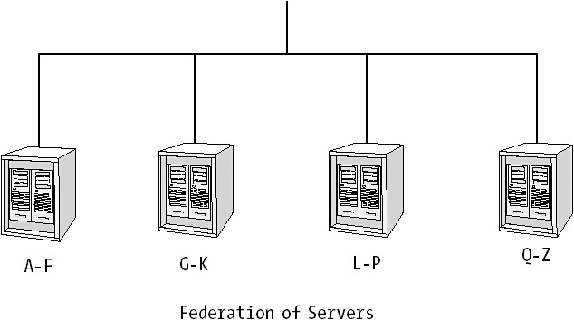 A distributed partitioned view uses a federation of servers to store data. Although this sounds like something out of Star Wars, it is really quite simple. A federation of servers consists of two or more servers, each holding one partition of the data (see Figure 8-18).