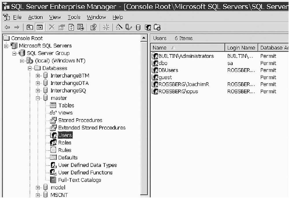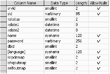 If you use SQL Server authentication, SQL Server matches the account and password the user supplies to a list that is stored in the sysxlogins system table. This table is found in the master database (see Figure 8-19). SQL Server authentication is quite easy to implement, and you use SQL Server Enterprise Manager to add, remove, or modify these logins (see Figure 8-20).