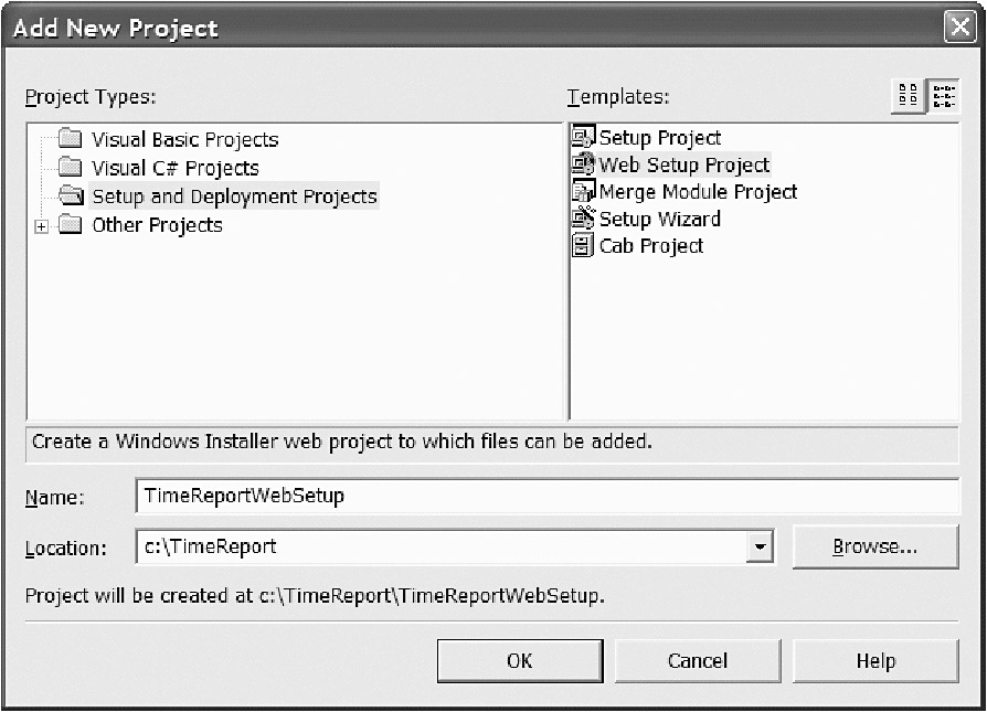 Next, we select the Web Setup Project option and name it TimeReportWebSetup. Figure 9-80 shows the setup project.