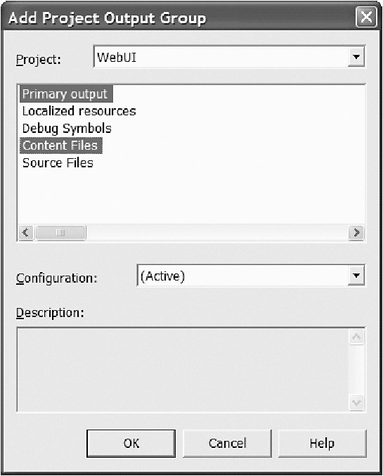 After specifying the WebUI project in the combo box, we select Primary Output (which is our webui.dll—the code-behind classes) and Content Files (which are our Web pages) as shown in Figure 9-81.