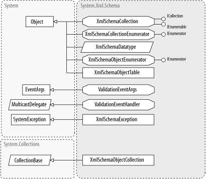 Chapter 17. The System.Xml.Schema NamespaceThe System.Xml.Schema namespace is responsible for .NET's implementation of the W3C XML Schema specification, a mechanism for constraining the content of XML documents. In .NET, an XML Schema document (XSD) can also be used to generate classes that know how to serialize themselves to and from XML (see the System.Xml.Serialization namespace for more on serialization). .NET supports Version 1.0 of XML Schema, Section 1 (XML Schemas for Structures), and Section 2 (XML Schemas for Data Types). Documentation for Section 1 is available online at http://www.w3.org/TR/xmlschema-1, and documentation for Section 2 is at http://www.w3.org/TR/xmlschema-2. For more information about the XML Schema specification, see XML Schema, by Eric van der Vlist (O'Reilly). All types in this namespace that represent an element of an XML Schema document derive from the XmlSchemaObject type, although there are numerous intermediate base classes. Other types in this namespace include those used to collect related XML Schema objects, such as XmlSchemaObjectCollection, and those used to provide additional information about the XML Schema validation process, such as ValidationEventArgs. Figure 17-1, Figure 17-2, and Figure 17-3 show the many types in this namespace. Figure 17-1. XMLSchemaObject and derived types![]() Figure 17-2. More descendants of XMLSchemaObject![]() Figure 17-3. Remaining types from System.Xml.Schema![]() |