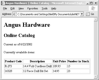 Example 7-2 shows the HTML output resulting from processing inventory.xml with catalog.xsl, and Figure 7-1 shows a screenshot of the HTML in a web browser. Example 7-2. HTML output from the catalog.xsl stylesheet<html>