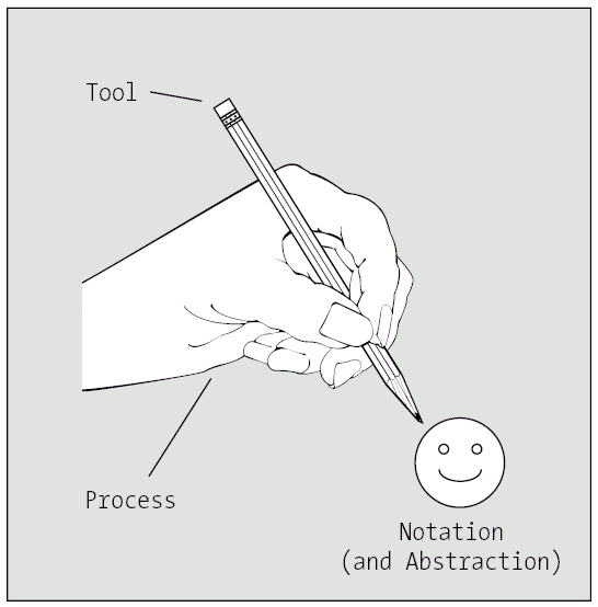 To help illustrate this point, let's use a simple analogy. Say that our goal is to cheer people up. We decide to hand draw (process) a smiley face (an abstraction of the desired behavior, rendered with a graphical notation) with a pencil (tool), as shown in Figure 8-2.