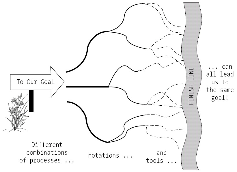 The same is true for software development: the real legacy of a software development project is the resultant software system, which is, after all, the reason for using a methodology to produce a model in the first place. We must take care to avoid getting so caught up in debating the relative merits of one methodology versus another that we fail to produce useful software; as you can see in Figure 8-3, there are many paths to the same destination.