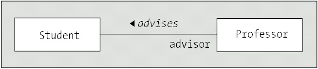 With OMT notation, a precursor notation to UML, we were instructed to label associations so that their names made sense when reading a diagram from left to right, top to bottom. There was thus an incentive to arrange classes in our diagram in whatever way would make association names less "awkward." In the preceding examples, placing the Professor class above or to the left of Student simplifies the association name. Achieving an optimal placement of classes for purposes of simplifying all of the association names in a diagram is often not possible in an elaborate diagram, however. Therefore, the UML has introduced the simple convention of using a small arrowhead () to reflect the direction in which the association name is to be interpreted, giving us a lot more freedom in how we place our class rectangles in a diagram, as shown in Figure 10-16.