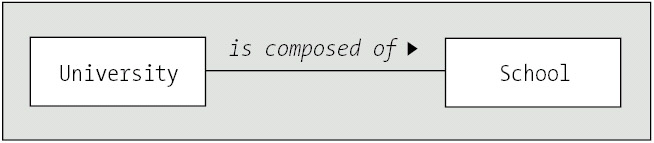 As we mentioned when we first introduced aggregation in Chapter 5, however, you can get by without ever using aggregation! To represent the preceding concept, we could have just created a simple association between the University and School classes, and labeled it "is composed of" as shown in Figure 10-20.