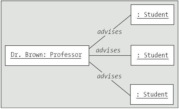 Therefore, if we wanted to indicate that Dr. Brown, a Professor, is the advisor for three Students, we could create the object diagram shown in Figure 10-38.