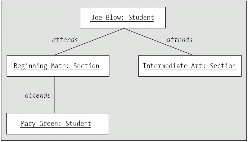 To reflect that a Student by the name of Joe Blow is attending two Sections this semester, one of which is also attended by a Student named Mary Green, we could create the diagram in Figure 10-39.