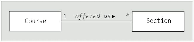 Given Figure 10-40, which shows the association "a Course is offered as a Section," we see that a Course object can be related to many different Section objects, but that any one Section object can only be related to a single Course object.