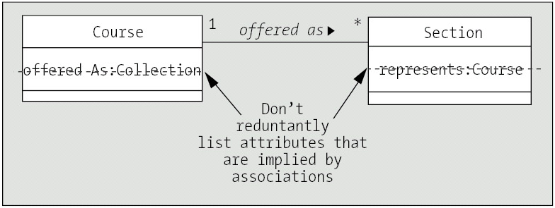 This is a mistake commonly made by beginners. The biggest resultant problem with doing so arises when using the code generation capability of a CASE tool: if the attribute is listed explicitly in a class's attributes compartment, and also implied by an association, it may appear in the generated code twice, as shown in the following snippet representing code that might be generated from the erroneous UML diagram shown in Figure 10-41: