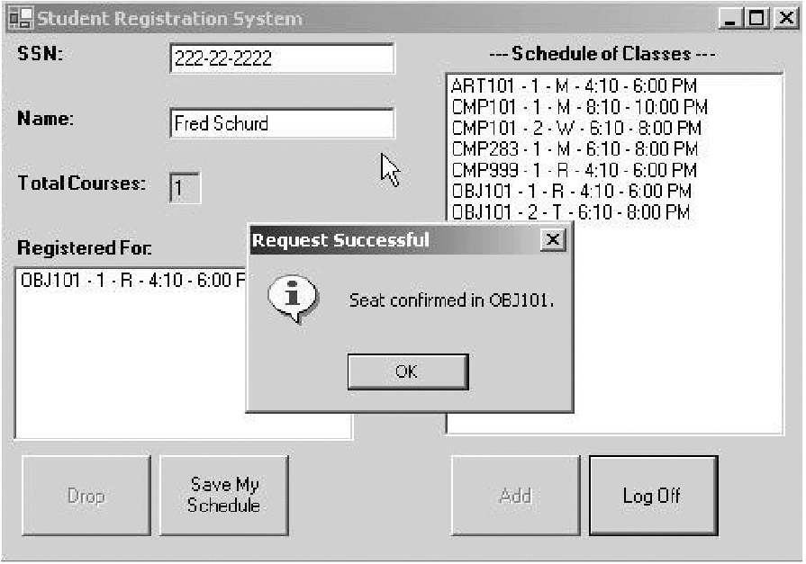 From Fred's vantage point (sitting in front of a computer screen!), here's what he perceives to be occurring: after logging on to the SRS, he indicates that he wishes to register for OBJ101, section 1 by choosing it from the available course list, and then clicks the Add button (see Figure 11-5).